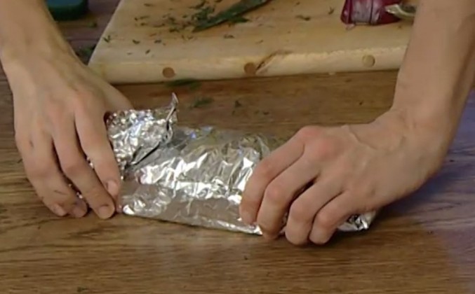 6. Подготавливаем большой кусок фольги в два слоя, выкладываем в центр "подушку" из измельченного укропа. Сверху выкладываем форшмак в форме буханки-рулета, посыпаем остатками измельченной зелени сверху.