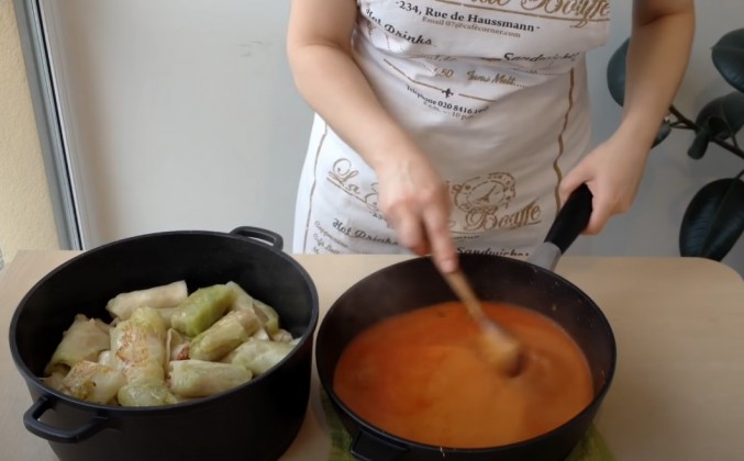 4. Выложили в кастрюлю, где будем тушить. Лук на подливу поджарить до золотистой корочки практически без масла. Высыпаем морковку. Когда она схватилась – не прожарена, но и не сырая – перемешиваем с томатом. Доливаем немного воды. Добавляем ложку сметаны. Всё перемешиваем. Доливаем воды, чтобы покрыть все голубцы. Добавить специи: лавровый лист, перец. Посолите по вкусу. Добавляем воду. Посолите подливу, но не пересолите, так как вода будет выкипать. Поперчите. Залейте голубцы. Если кастрюля эмалированная – положите на дно капустные листы. Заливаем, ставим на медленный огонь на минут 30-40, до готовности. Количество подливки определите по своему вкусу. Можете подливку не делать, можно взять просто бульон подсоленный. Можете не обжаривать. Голубцы приготовились. Янтарного цвета, очень вкусные. Соус красивый, нежирный, вкусный. Вы можете брать любой соус или подливу.Видео рецепт ютуб ниже 👇