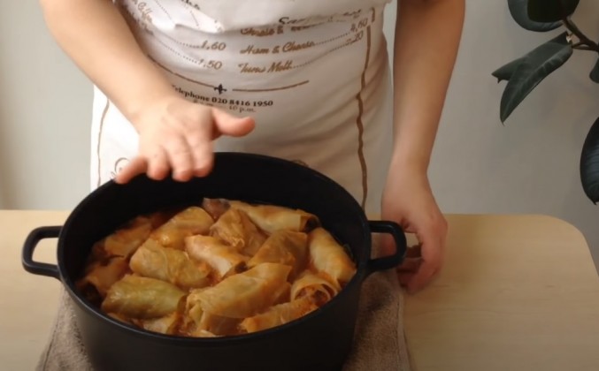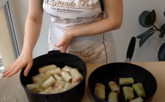 3. Берем лист. Где толстая прожилка – вырезаем ее. С одной стороны. С другой стороны режем лист до конца. Берем лист. Десертную ложку фарша. Где край срезан – голубец будет открытым. Накрываем, заворачиваем вовнутрь с каждой стороны. Получается красивый голубец, аккуратный, маленький. Можно сделать еще меньше – поделите половину листа пополам. Но их делать дольше. Можно все голубцы обжарить в сковороде по 1,5-2 минуты с каждой стороны, масла лить очень мало. Вкус – другой. Но очень вкусно. Будет стрелять – капуста в воде, при контакте с маслом будет стрелять. Итак, закручивайте голубцы. Если хотите - обжарьте их с двух сторон, я покажу, как это делать. Или сразу складывайте в кастрюльку. Получилась полная миска голубцов. Покажу на небольшом количестве, как обжарить. Можно этого не делать. Но это вкусно, попробуйте. 2 минуты начали жариться, только схватились – сразу переворачивать. Сверху голубцы обжарены с двух сторон.