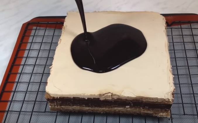 9. Берем противень, застилаем его силиконовым ковриком или пищевой пленкой, а сверху устанавливаем решётку. Когда глазурь остыла до рабочей температуры, достаем торт из морозильной камеры, извлекаем из формы, устанавливаем его на решетку и заливаем глазурью. Остатки глазури, которая стекла с торта и осталась на силиконовом коврике, нужно процедить через сито. Если она у вас уже успела остыть и загустеть, тогда прогрейте её в микроволновке до жидкого состояния. Все лишнее осталось на сите, а чистую глазурь можно повторно использовать для других десертов. Накрываем ее пищевой плёнкой в контакт и храним в холодильнике.