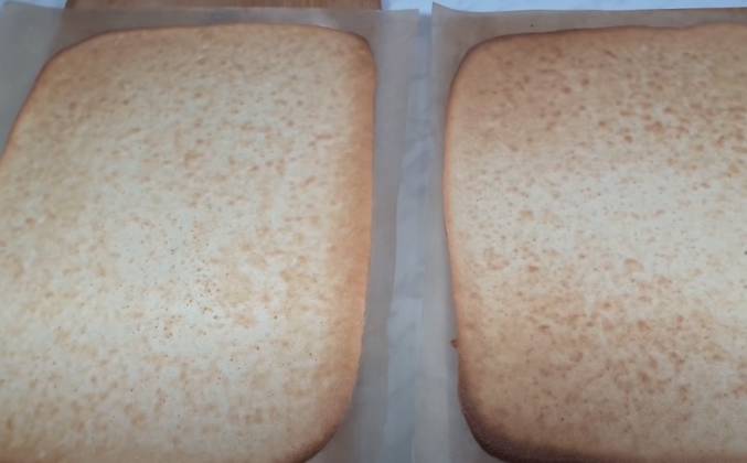 3. И отправляем в заранее разогретую до 180 градусов духовку в режиме "конвекция" или при 185 градусах на режиме "верх-низ" без конвекции, приблизительно на 12 минут. Я выпекала бисквиты на двух уровнях одновременно, в середине выпечки поменяла противни местами, чтобы коржи пропекались равномерно. Когда видите, что бисквиты зарумянились - можно доставать. Сразу снимаем с горячих противней, даем немного остыть, буквально минут 5, накрываем пищевой пленкой, чтобы сохранить влагу в бисквитах и оставляем остывать и ждать своей очереди.