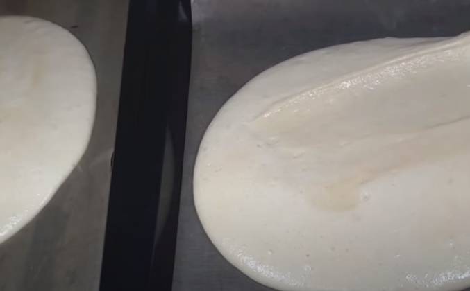 2. Яично-миндальная масса должна значительно посветлеть и увеличиться в объеме, а тесто стекающая с венчика оставляет отчетливый след на поверхности. Добавляем к этой массе растопленное остывшая сливочное масло и перемешиваем силиконовой лопаткой до объединения. Добавляем через сито пшеничную муку, перемешиваем и в два приёма добавляем французскую меренгу, аккуратно перемешивая лопаткой до однородности. Важно помнить, что чем дольше и старательнее мы перемешиваем, тем более жидким становится тесто и теряется объем, поэтому действовать нужно аккуратно, но быстро. Распределяем тесто на 2 противня, предварительно застелив антипригарными ковриками или антипригарной бумагой для выпечки. Помогаем тесту равномерно распределиться тонким слоем, стараясь не мучить его сильно долго.