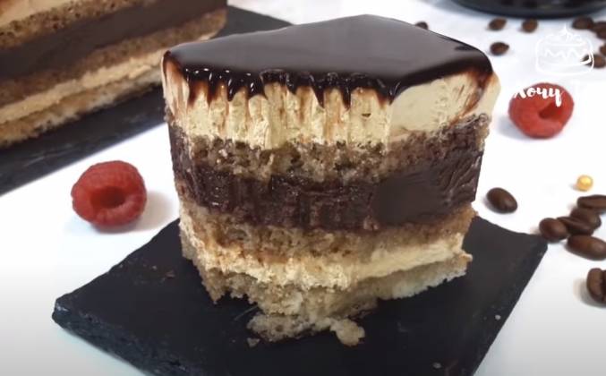 10. Можно ненадолго убрать торт в холодильник, а когда глазурь хорошо схватилась, острым ножом срезаем края, чтобы торт получился ровным. Переносим торт на блюдо для подачи и можно наслаждаться этим вкуснейшим десертом с ярким кофейно-шоколадным вкусом. По желанию, в качестве украшения можно добавить свежие ягоды или кофейные зерна. Как вариант, для подачи можно нарезать торт на тонкие порционные пирожные. Как видите, этот торт не очень сложный, его можно вполне приготовить за один вечер. Главное, делать все по инструкции. Если вы решитесь приготовить этот торт, то никогда об этом не пожалеете, настолько у него божественный вкус! Несмотря на большое количество сливочного масла в этом десерте, он совершенно не ощущается жирным.Видео рецепт ютуб ниже 👇