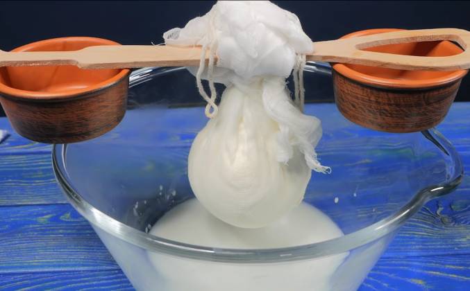2. Подставляю небольшие плошки, если делать это аккуратно и придерживать руками, ничего никуда не упадет и будет прекрасно держаться. Минимальное время которое должно простоять это сооружение - 12 часов, я иногда даже оставляю на сутки. Сыворотка прекрасно отделилась, теперь развязываю мешочек. Вот он - потрясающий домашний кремчиз, с отличным молочно-сырным запахом и вкусом, и Консистенция у него густая и кремовая.
