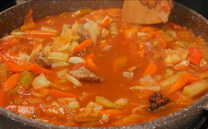 2.  Лучше взять кусочки, либо можно как я - целые порезать более мелко. Мясо с овощами под крышкой и тушу на медленном огне 20 минут, буду добавлять следующую партию овощей. Измельченный чеснок, зеленую редьку, нарезанную брусочками, примерно такого же размера как морковь. Наверное, многие уже поняли, что готовлю я ваджу, то есть основу для лагмана. Помимо редьки, в этот момент закладываю кусочки сладкого перца. Для остроты можно добавить и жгучий перец, но у меня лагман ели дети, поэтому я его не добавляла. И еще не крупно нарезаю. Белокочанную капусту, Также отправляю в жаровню. Все перемешиваю выливаю горячую воду и под крышкой готовлю воджу для лагмана ещё 20 минут. По необходимости в конце приготовления можно добавить соль.