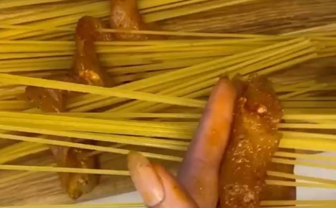 2. Я насадила на кусочки курицы спагетти и положила в сковороду с маслом. Перевернула через минуту, добавила лук, обжарила и залива водой. Немного, чтобы вода покрыла все макароны. Посолила и закрыла крышку. ⠀