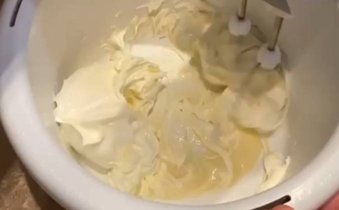 3. Готовим крем. Маскарпоне взбиваем со сгущенкой, добавляем ванилин на кончике ножа и добавляем сахарную пудру по вкусу. Вместо крема можно взять любой джем, либо сделать любой крем, который вы любите, например взбить жирную сметану с варёной сгущёнкой. ⠀ Остывший бисквит смазываем кремом, по желанию на крем можно выложить джем и сворачиваем бисквит в рулет.
