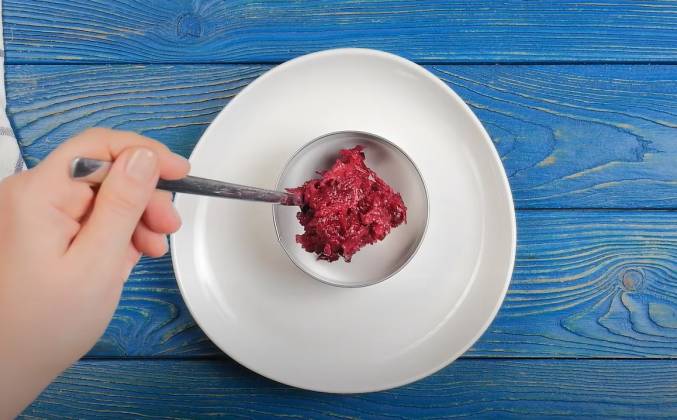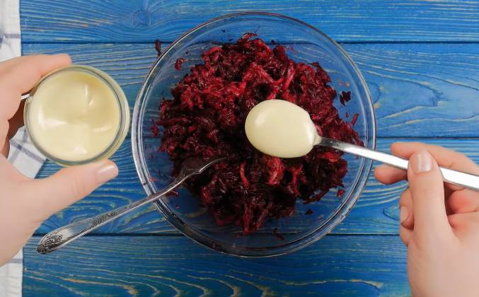 2. От натертых огурцов получается достаточно много сока, его я обязательно сливаю и огурцы немного отжимаю. Точно также натираю запеченную свеклу и, Если выделяется сок, тоже его сливаю.Видео рецепт ютуб ниже 👇