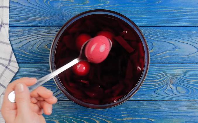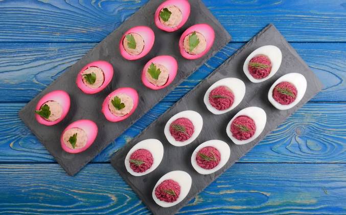 Яйца фаршированные свеклой и икрой сельди по рецепту канала Здоровое питание. Свекла может быть не только ингредиентом салата или закуски, также она может использоваться для придания этой закуски яркого и красивого цвета! Вот так фаршированные яйца выглядят на столе - ярко, эффектно притягательно и очень аппетитно! Кипельно-белый со свекольной начинкой, с легким селедочным послевкусием и лопающиеся икринками, а еще Ярко-розовые с очень нежной, но пикантной начинкой. Зернистая горчица, в которой будет напоминать икринки.
