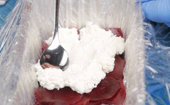 2. Застилаю её пищевой пленкой, на дно выкладываю ломтики свеклы, максимально заполняя все пространство. На слой свеклы равномерно распределяю одну третью часть творожно-сырной начинки. Совсем немного посыпаю сушеным орегано и сушеном тимьяном, Далее выкладываю следующий слой из ломтиков вареной свеклы. Снова творожная сырная масса, Разравниваю и посыпаю орегано и тимьяном, и еще раз повторяю оба слоя и самый последний - слой ломтики свеклы.