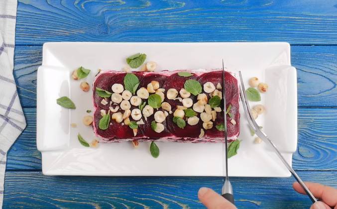 Следующая закуска из свеклы несложная в исполнении, продуктов немного и они простые, но результат просто потрясающий! Овощной Террин из свеклы по рецепту канала Здоровое питание. Мне иногда даже этот террин резать жалко, а еще он мне напоминает тортик! Такой яркий и вкусный свекольный тортик! Террин из свеклы и выглядит и на вкус восхитителен. Орехи и мята здесь очень к месту. Прекрасно дополняют и гармонируют с другими компонентами закуски.