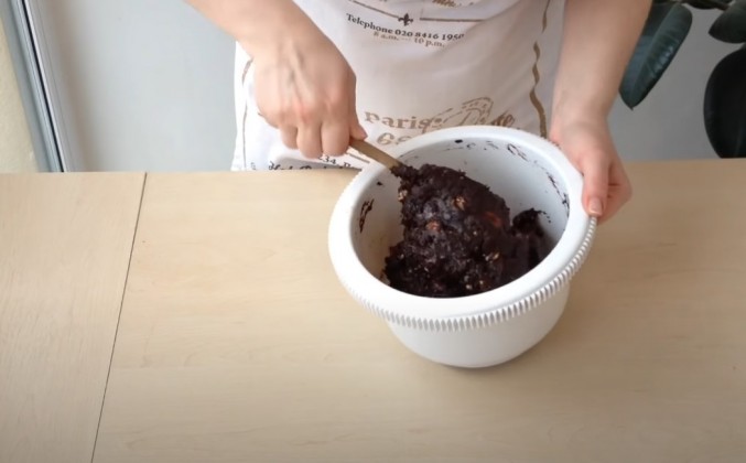 2. Добавляем оставшуюся часть. Масса должна получиться однородная, в ней нет жидкости. Печенья уходит около полкилограмма, плюс-минус 50 г. Раскатайте пищевую плёнку на столе, выложите 3-ю часть смеси. Формируем среднюю (не толстую) колбаску, хорошо заворачиваем. Полностью закрываем. Равняем края. Скатываем. Получится 3-4 колбаски. Кладём в холодильник на 1,5-2 часа, она застынет. С застывшей колбаски снимаем плёнку и заворачиваем в бумагу для выпечки. И потом удобно разворачивать и резать.