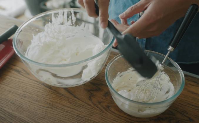 2. Перенесите смешанную в чашу со взбитыми сливками. и смешайте его с резиновой лопаткой. Разделите его на 3 контейнера (по 150 мл каждый). Разбейте печенье и положите его на дно. Вместимость сырного пирога составляет около 300 мл. Вы можете поместить их все в один большой контейнер, если хотите. Он становится таким же мягким, как тирамису. когда ты делаешь это без желатина. Пожалуйста, добавьте еще 20 г сливочного сыра, если ты хочешь сделать это немного сложнее.