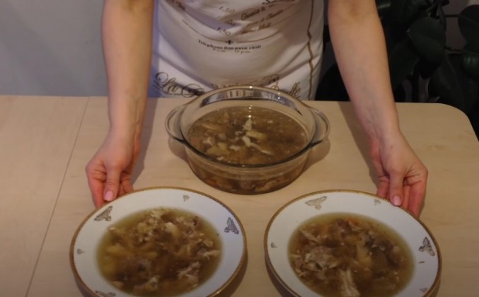 4. Нужно просто поставить в горячую воду на 3 секунды и вынуть и перевернуть. Тогда он будет красиво держать форму и можно подавать на стол. Посмотрите, я сделала фотографию и он весь прозрачный внутри и очень красивый. Это очень простой рецепт. Времени занимает много, но ничего в это время делать не нужно: пока 5-6 часов он томился, застывал. Но делать очень просто: закинул, оно варится, потом разобрал, залил по тарелочкам и всё. Очень просто на самом деле. И вкусно!Видео рецепт ютуб ниже 👇