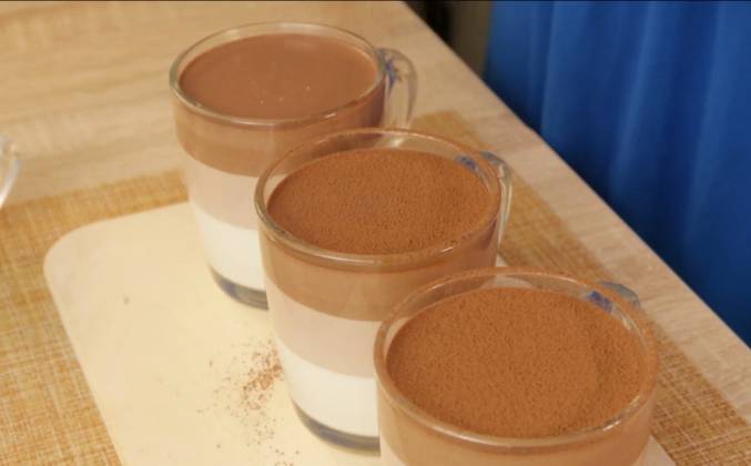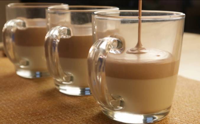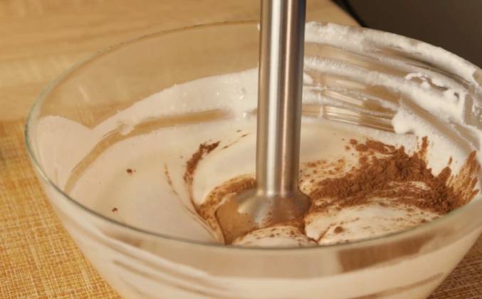 2. Накидываем сюда же немного сахара. И еще кокосовое молоко! Самое время использовать ту самую смесь что мы замешивали ранее. Окей, миксуем! Получается немного слабовато. Нужна штучка посерьезнее! О, да! Так гораздо быстрее! Надо смешать как можно более качественно. Готов наш первый слой! Отставляем тарелку в сторону и готовим кружки. Наливаем первый слой в каждую кружку на 1/3. Делаем второй слой! Добавляем сюда какао! И точно также качественно всё перемешиваем! Прикольный момент! Вентиляторы мощные... Лучше не засовывать туда пальцы... :) Кхм... готов второй слой! Наливаем его в кружку аналогично. Ложкой получается более дозированно. Так что можно достаточно легко выставить нужный уровень жидкости. Минус способа в том... ...что это не так быстро :) Немного ускоримся.