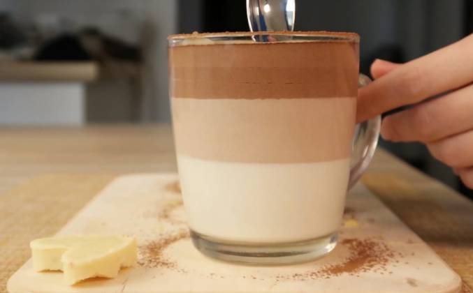 3. Третий слой! Еще больше какао! Заполняем кружки третьим слоем. Готово! Осталось только украсить. Решено посыпать всё это дело какао. Так будет смотреться гораздо веселее! Хотели было добавить еще немного шоколада... ...но Получается что-то не очень красиво. Так что лучше отмотаем назад. Все-таки с шоколадом у нас сегодня незадалось. Со второй попытки также не получилось ничего путного! Поэтому лучше совсем без него :) Попробуем наши три шоколада! Вкусно! Предлагаю и вам попробовать! Мм? Реально получилось вкусно. Я, пожалуй, еще возьму. А главное - удобно. Кушать его из чашки особое удовольствие.