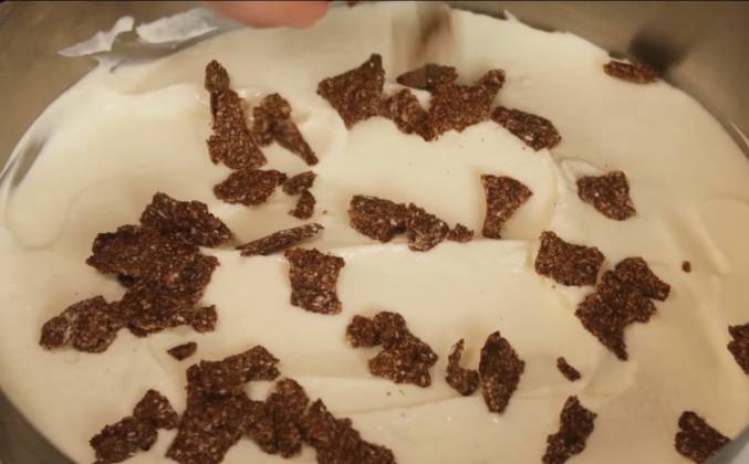 2. Посыпаем раскрошенными печеньками орео У нас печеньки собственого производства Можно было бы поделиться им с вами... но рецепт этих печенек крайне не понравился. Если будете добавлять печеньки - их нужно немного утопить или изначально перемешать с твороженной массой Убираем в разогретую духовку 180°С (356°F) примерно на час ниже в духовке поставим противень с водой, чтоб чизкейк не потрескался. Пока печется чизкейк приготовим коржи. Всех ингредиентов нам понадобится в двойном обьёме для двух коржей Для этого смешаем яйца, Кефир Процент жирности особого значания не имеет у меня 2,5%. крахмал разрыхлитель и какао. Все хорошо перемешиваем до растворения всех комочков. [звук лопающихся пузыриков] Классный звук! Какао немного сбежало на стол :)