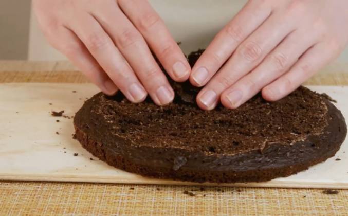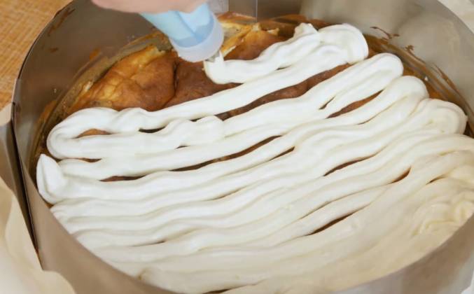 4. Делаем прослойку из крема... ...чтобы корж потом хорошо приклеился к чизкейку. И кладем непосредственно сам корж. Переворачиваем форму для выпечки. Здесь главное быть аккуратнее... Чтобы торт не улел от нас далеко :) ЙЁ! Упс. Надеюсь, он не сильно там пострадал :) Снимаем пергамент, он не понадобится больше Смазываем и с этой стороны кремом также для лучшего сцепления коржа и твороженной массы. Крем как клей. За счёт него корж не отлетает далеко от торта... ...даже если неудачно его перевернуть :) Окей, приклеим наш коржик к чизкейку. Посыпаем перемолотыми печеньками Oreo. Готово, наконец-то можно снять форму. Пока что вид у тортика не самый привлекательный... ...сейчас мы его поправим.