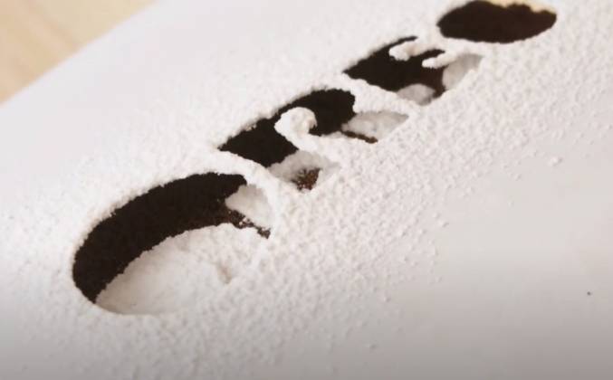 5. Для этого наносим крем на боковину нашего тортика. И обсыпаем бортик теми же перемолотыми печеньками Oreo! Мелкодисперсная крошка очень хорошо прилипает к бортикам за счёт крема. Некоторые крошки осыпаются вниз. Это можно подобрать и использовать снова. Готово... ...остался только лишь один штрих. Надпись! Как же без неё? :) Точно такой же макет можно сделать из коробки с печеньками Oreo. Для тех у кого его нет лазерного принтера. Просто вырезаем надпись канцелярским ножом... ... а затем иголками намечаем точное расположение надписи. Буквы О требуют немного больше внимания ) Готово... теперь вытаскиваем иголки. Посыпаем сахарной пудрой.