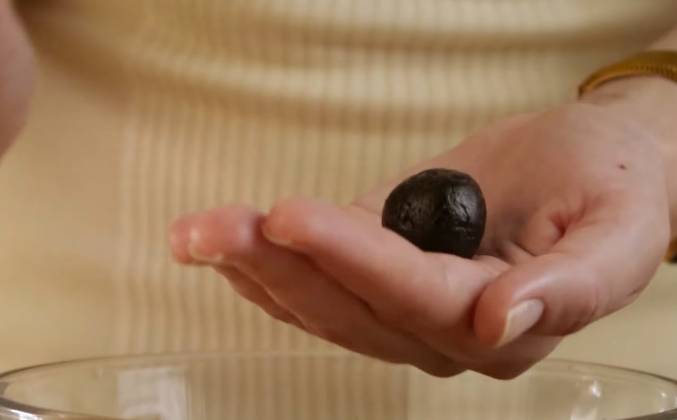 2. Такое примерно должно получится тесто. Оно должно быть довольно липким, чтобы получились красивые конфетки. Теперь с помощью чайной ложки я отмеряю тесто и формирую более-менее красивые шарики. Это все сделать очень просто, на самом деле и сам рецепт не займет много времени. Всего у нас получилось 16 немаленьких шаров. Теперь дело за малым - нужно растопить шоколад. Изначально мы хотели использовать и белую глазурь и темную, но к сожалению окунув шарик в белый шоколад, мы обнаружили, что это не выглядит красиво и пришлось оставить только темную глазурь. Так что не весь белый шоколад можно использовать в качестве глазури. Значит, окунаем шарики в темный шоколад.