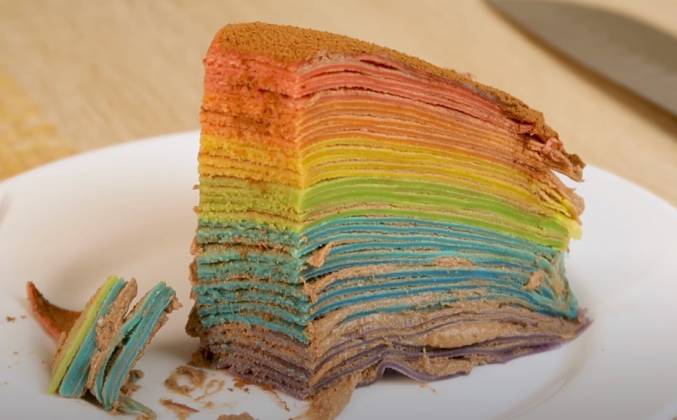 3. Собираем торт: один блинчик по цвету (начнем с фиолетового, затем синий, голубой, зеленый, желтый, оранжевый, красный), между блинами промазываем кремом (примерно по одной столовой ложке крема на каждый слой). Сверху украсить (по желанию).Видео рецепт ютуб ниже 👇