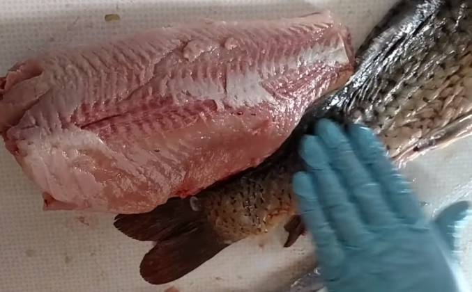 2. Взять за хребет у самой головы, при этом доломать позвоночник и отделить мясо от кожи возле головы, и вывернуть позвоночник наружу. Отделить вдоль позвоночника кожу. Подрезаем под плавниками и аккуратно вот такими движениями снимаем кожу с хвоста, а конец хвоста отрезаем. Кожу вывернуть наружу. Отделить мясо от костей. Кости отправить в воду и проварить несколько минут, так будет легче отделить остальное мясо. Пропустить мясо рыбное, свиное и говяжее через мясорубку вместе с луком, чесноком.