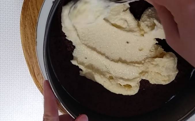 2. Добавить крахмал, перемешать на малых оборотах миксером. Выложить на бумагу для выпечки, на котором с обратной стороны отрисовать круг. Переложить на форму. Сушить при 130 градусах полтора часа. Приготовить заварной крем, рецепт я оставлю под видео. Собираем торт. Шоколадный бисквит разрезаем пополам. Пропитать слегка сладким кофе первую половину.
