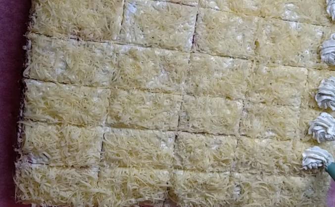 4. Смазать верх торта. Поверх натереть на мелкой терке твердый сыр. Торт я условно разделила на порционные кусочки, а потом порезала ножом. На каждый кусок выдавила цветочек из крема. Внутрь каждого цветочка кладу кусочек ананаса или можно заменить оливками. Украсить полукольцами огурца. Приятного аппетита!Видео рецепт ютуб ниже 👇