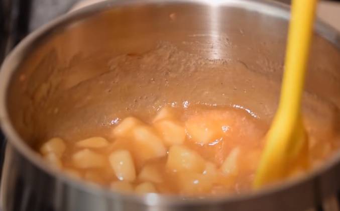 2.  Снять сотейник с огня и добавить разбухший желатин, хорошо перемешать до полного растворения желатина. Кольцо диаметром 18 см затянуть полиэтиленовой пленкой и положить на ровную поверхность, например разделочную доску. Вылить яблочное компоте в кольцо и убрать в холодильник на 1 час. Приготовить карамельный мусс. Желатин залить холодной водой и оставить на 10 минут для набухания. В сотейник с толстым дном насыпать сахар, на среднем огне растопить сахар до получения янтарного цвета, как только сахар подтает, можно перемешивать его силиконовой лопаткой.