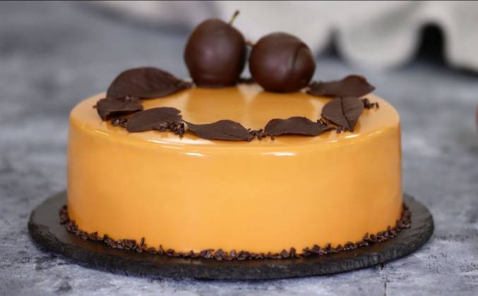 7.  Приготовить зеркальную карамельную глазурь по указанному рецепту. Достать торт из морозильной камеры, вынуть из формы. Удалить ацетатную пленку, и переложить на решётку. Покрыть торт зеркальной глазурью, и переложить торт на блюдо. 8.  Убрать торт в холодильник на 4-6 часов до полной разморозки. Готовый торт украсить по желанию шоколадными листьями и шоколадной крошкой. Приятного аппетита!