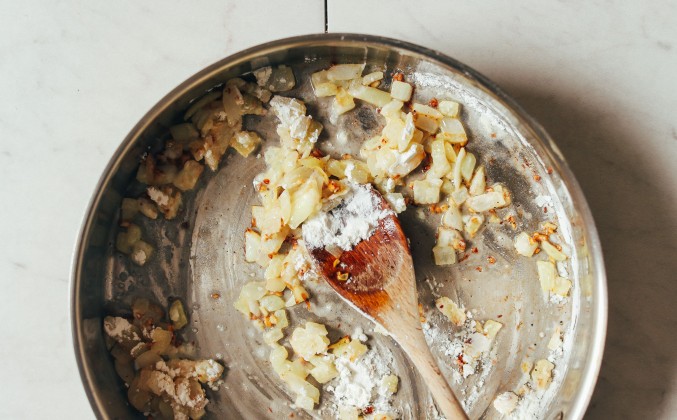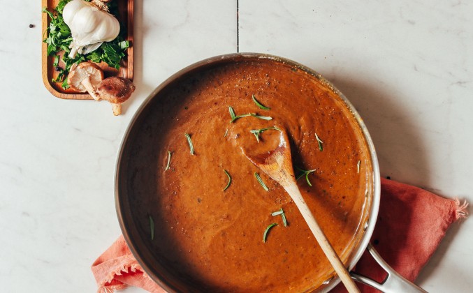 3. Затем перенесите обратно в сковородку и разогрейте на медленном огне еще 2-3 минуты. В это время вы можете добавить немного миндального молока, чтобы немного осветлить цвет и вкус (по желанию), но мы решили не делать этого. Попробуйте и отрегулируйте приправы по мере необходимости, добавив больше соли и перца по вкусу. Если соус слишком жидкий, выкопайте небольшую часть соуса и взбейте с 1-2 ч.л. кукурузного крахмала до образования комков. Затем добавьте его обратно в большую партию - повторяйте по мере необходимости, пока желаемая густота не будет достигнута. Если он слишком густой, добавьте немного зарезервированного овощного бульона.