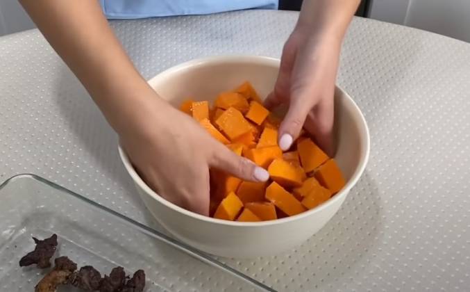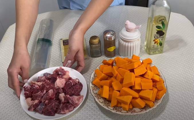 Всем привет, друзья! Сейчас осень, время тыквы. Поэтому сегодня поделюсь хит-рецептом блюда из тыквы запеченной в духовке с мясом рецепт проще простого. Нам понадобятся: Говядина (можно с жиром или без него). Тыква (очищаем от кожуры и режем на кубики) Сейчас мы будем мариновать мясо и положим посолим тыкву. Для маринада нам понадобятся соль, паприка и черный перец. По желанию, можно добавить базилик и другие приправы, которые Вам нравятся. Мясо будем готовить в рукаве. Если у Вас нет рукава, то можно приготовить в фольге. Но имейте ввиду, что в фольге мясо дольше готовится чем в рукаве. И обязательно растительное масло. Это тыква, приготовленная с мясом в духовке просто восхитительная.