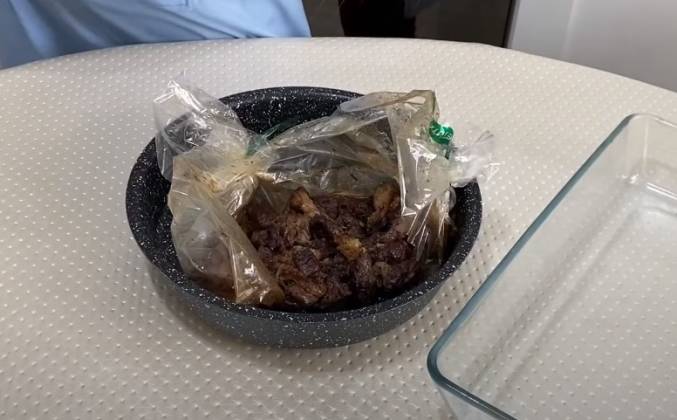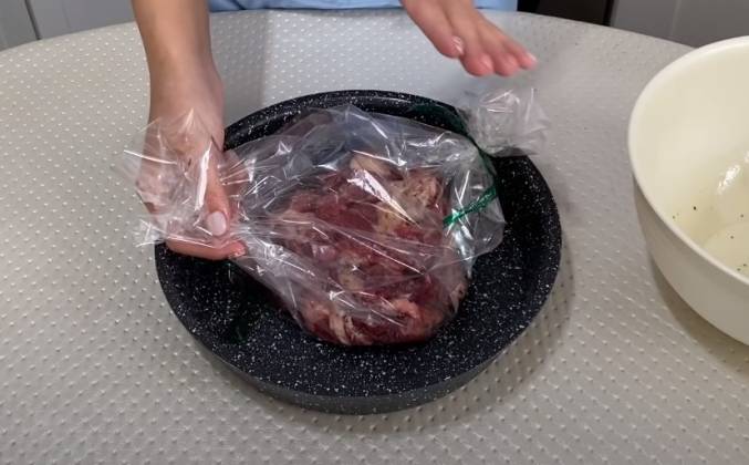 2. Мне этот рулон хватает на 1 год. Я не скажу, что пользуюсь часто. Мне нравится печь курицу в рукаве. Печь можно не только мясо, но и овощи, такие как кабачки, баклажаны. В середине есть лента для связывания. Делим на 2 части. Теперь кладем мясо. С начала нужно завязать с одной стороны, чтобы мясо или сок не вышел. Под низ кладем противень или жаропрочную посуду, потому что может пригореть. Внутрь кладем маринованное мясо. Я готовлю 2 порции. На свое усмотрение можно положить больше мяса. У нас на гарнир будет тыква. Нужно сделать в рукаве проколы деревянной шпажкой. Готово. Теперь ставим в разогретую духовку при температуре 180 градусов приблизительно на 1 час.