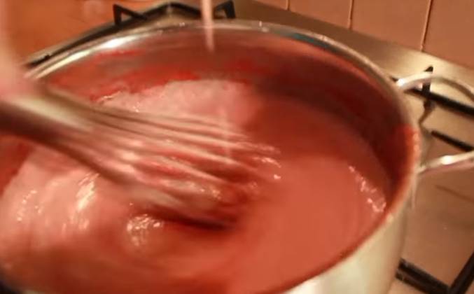 2.  Выливаем закипевшее пюре в яичную массу. Тщательно перемешиваем венчиком (2-3 минуты) Возвращаем все в кастрюлю. Добавляем в кастрюлю 100 г. молока, перемешиваем. И ставим кастрюлю на огонь. Доводим до кипения (не забываем помешивать!) Кипятим массу 30 секунд. Выключаем огонь! Добавляем 50 г. сливочного масла в кастрюлю. Еще раз перемешиваем, содержимое кастрюли, до получения однородной массы. Клубничный крем для торта готов! Убираем крем в холодильник и приступаем к коржам для нашего. Наполеона. Для коржей нам понадобится 1 кг бездрожжевого слоёного теста. (рецепт теста - ищите по авто-подсказкам или в описании к ролику) Аккуратно раскатываем тесто. Делим лист теста на 3 равных части. Оставляем для раскатки 1/3 часть теста.