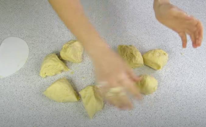2. Подкатать тесто в шарики и убрать на пару часов в холодильник на тарелке под плёнкой. По прошествии времени из холодильника достать один шарик теста (все остальные ждут в холодильнике!). На присыпанном мукой пергаменте, раскатать тесто тонко-тонко и вырезать диаметр будущего коржа. После выпечки коржи станут меньше. Я вырезала крышкой от сковороды диаметром 23,5 см, на выходе коржи получились около 20,5 см. Корж наколоть вилкой, обрезки убрать в холодильник . Выпекаем при 220 °C около 5-7 минут до светло-золотого цвета.