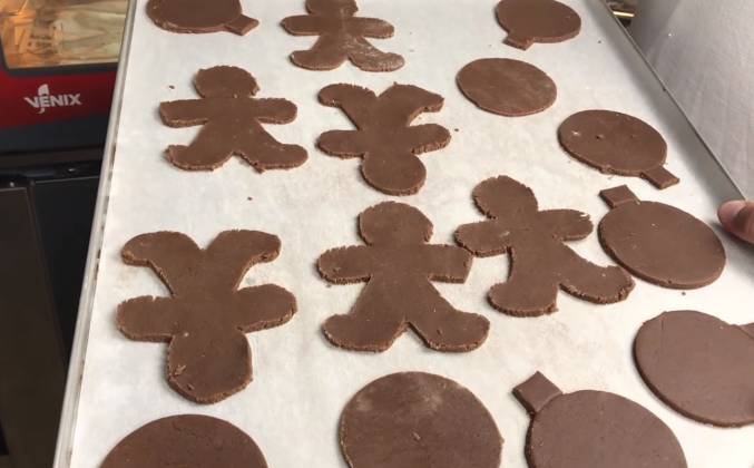 4. Елочную игрушку можно сделать несколькими способами можно просто вырезать еще есть способ когда мы не прорезаем тесто выемкой. А только намечаем линию шара. Потом присоединяем к ней вот такую штуку, за которую его вешают на елку, А затем аккуратно по намеченной линии вырезаем елочную игрушку. И вот, мы вырезали наши будущие пряники. Теперь нам осталось их испечь. Печка у нас стоит на 170 градусов с вентиляцией. Пряники в духовке проведут примерно 10-12 минут. Вот и всё! Прошли десять минут, наше имбирное печенье готово! Смотрите, какие они прекрасные! Пахнут - просто закачаешься! Мы их ставим на шпильку, пускай они остывают. Когда они остынут, мы начнем их разрисовывать, Вот и все.Видео рецепт ютуб ниже 👇