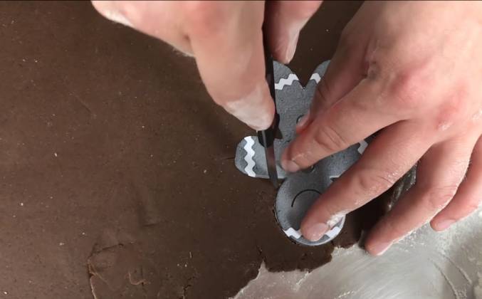 3. Не забываем подпылять мукой. Мука вниз, мука наверх. Много муки не надо, тесто не липкое. Но совсем без муки тоже обойтись мы не можем. Раскатаем из него пласт. Вот мы раскатали тесто до толщины где-то 3 мм не очень толсто и не очень тонко. Теперь мы будем вырезать пряничные фигурки. Мы будем вырезать круглую елочную игрушку и мы будем вырезать человечка пряничного. Для пряничного человечка мы подготовили трафарет. Как сделать трафарет для пряников - ссылка на видео - в описании и перед вами на экране - ничего сложного нет. Все очень легко. Так, теперь мы начинаем пользоваться трафаретом. Берем нож. И - кстати, елочная игрушка! Нам нужно определиться с диаметром елочной игрушки. Вот такого размера будет наш шарик! Для начала сделаем человечков. Как же делать? Кладем фигурку человечка и сначала аккуратно маленьким острым ножичком просто прорезаем вокруг. Аккуратно, не не порежьте свой трафарет.