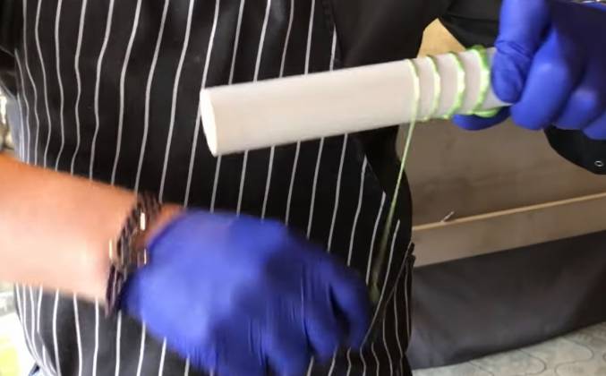2. Наматываем тонкую спираль из карамели на скалку. Оставляем спираль охладиться и застыть.