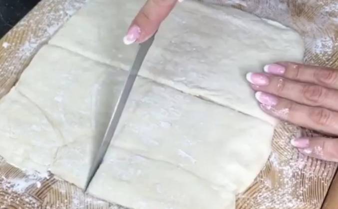 3. Раскатать пласт теста, но не очень тонко. Разрезать на четыре квадрата. На каждый квадрат выложить на средину большую ложку с горкой холодного крема. Сформировать конвертики, защипнув уголки.