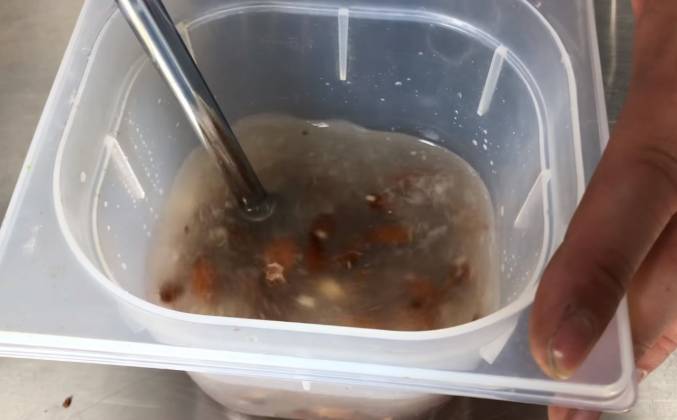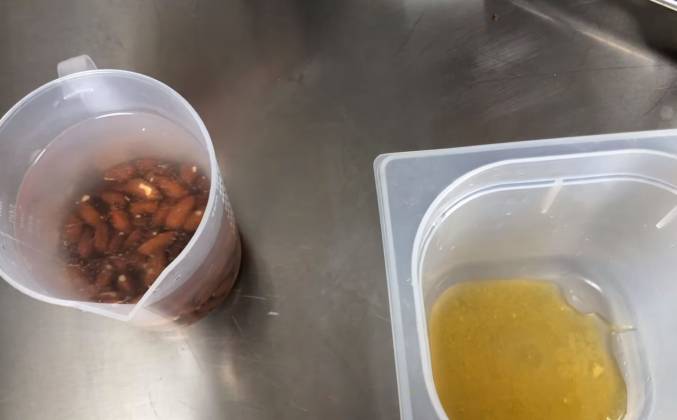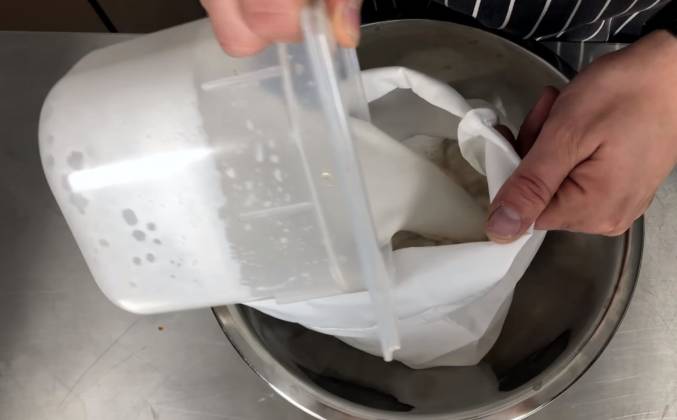 2. Я делаю погружным блендером. Если у вас есть знаете такой блендер с чашкой, делайте в нем - вообще никаких проблем. И теперь мы это все должны промиксовать. Итак, мы пробили миндаль с медом и водой, Смотрите, какая получилась у нас жидкость. Она полна крошек миндаля. Можно на самом деле это оставить. Еще пускай часик постоит но мы это будем сразу фильтровать никакой потребности нет. У меня такая марля. Ну, это не совсем марля, это - специальный пакет для вывешивания сыра. Здесь стекает сыворотка, но мы сюда сейчас выльем миндальное молоко. Все молоко - со всеми ошметками. Так вот ему дадим спокойненько здесь стечь. Если вы хотите, чтобы миндальное молоко было бы не кремового, а белого цвета, то почистите миндаль.