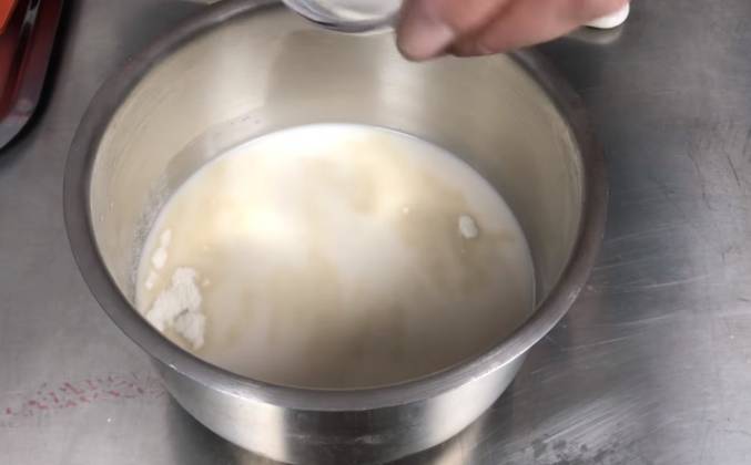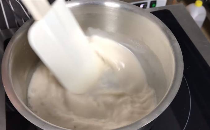2. Итак, все засыпали пожалуйста, теперь мы ставим это дело на плиту и начинаем греть. Греем, помешивая. Почему я помешиваю лопаткой? Специально для того, чтобы много воздуха туда не наколотить венчиком. Чтобы мне потом не пришлось эти большие пузыри лопать, когда я перелью в свою силиконовую формочку мой готовый, но все еще пока жидкий бланманже. Мы все это помешиваем. Наша задача - это закипятить и дать ему покипеть ну хотя бы секунд 15-20. Чтобы он покипел. Агар-агар работает только после 100 градусов. Есть на самом деле молекулярные порошки, которые помогают не кипятить и вообще не нагревать... то есть, есть разные фишечки... если вам интересно о том, какие бывают порошки для молекулярной кухни, вы напишете в сообщениях. Я вам обязательно расскажу.