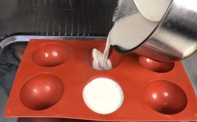 3. Итак, смотрите, вот - наша масса. Наше миндальное молоко с агар-агаром уже закипает. Не забываем помешивать. Помешивать - это важно. Вообще можно сюда добавить еще например ванильного стручка. Будет очень интересно, Вот - все, закипела. Даем покипеть. Смотрите видите, как быстро увеличивается. Это значит. что связей уже достаточно много. Давайте скинем немного температуру, чтобы сильно не кипело уж. Так, все! я чувствую что хватит. Даем этому немножечко остыть, чтобы оно, по крайней мере, перестало кипеть. Так, и теперь заливаем аккуратно в наших подготовленные формы силиконовые полусферические. Льём. Надо только ровно просто.