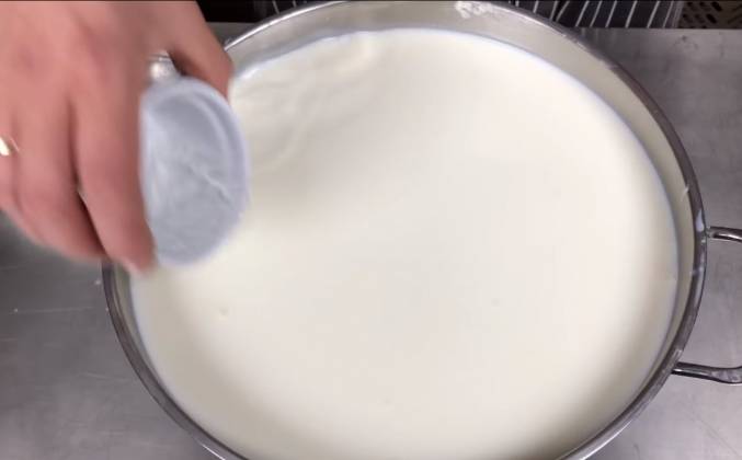 Этот сгусток желудок теленка может переваривать как полноценную пищу, а не как жидкое молоко Я, конечно, на сто процентов не уверен но думаю, что в желудках грудных детей тоже есть этот фермент когда они питаются молоком. Телячий сычужный фермент - главный ингредиент современного сыроделия. Вот что такое фермент сычужный, друзья мои! Как же делать сыр Халлуми? Я вам сейчас расскажу. Все очень просто! Первым делом мы нагреваем молоко. Молоко мы нагреваем до 32-35 градусов Цельсия. Видите, у меня 32 градуса молоко, и температура потихонечку растет до 35 градусов. Дальше, когда мы его нагрели... Нагрели не на полной мощности, а медленно и равномерно, мы берем разведенный в воде сычужный фермент и выливаем в молоко. Выливаем в молоко, чтобы он полностью растворился. Затем берём шумовку и аккуратно перемешиваем. Перемешиваем, чтобы сычужный фермент разошелся по всему молоку.