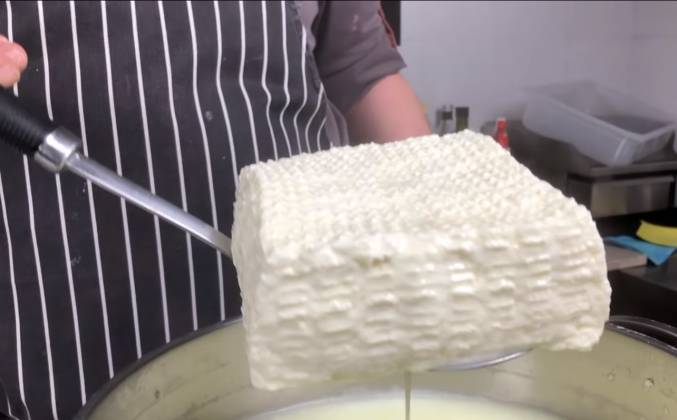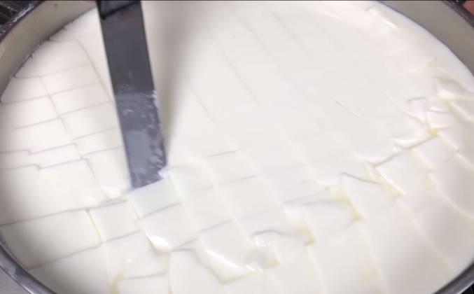 2. Теперь мы оставляем молоко под крышечкой примерно минут на 40 для формирования сгустка. Через 40 минут вернемся и посмотрим на сгусток. Если он хорош, увидите как он должен выглядеть. Если он еще не хорош, вы увидите как он выглядеть не должен. Вернемся через 40 минут, Итак. прошло 35 минут. Давайте смотреть наш сыр, Это еще пока не сыр, это еще пока сгусток. Вот видите, он образовался. Как проверяем его? Показываю. Берем аккуратненько ножичком и проверяем как он отделяется. Видите. нож выходит без кусочков сыра. Это значит что наш сгусток сформирован. Теперь мы должны его нарезать. Нарезаем на кубики примерно полтора - два сантиметра. Смотрите как мы это делаем. Погружаем нож и нарезаемдо самого конца. Пахнет коровой, потому что натуральное молоко, а не пастеризованное. Вот мы его порезали и теперь режем поперек. Мы нарезали весь сгусток. Что мы делаем дальше? Дальше мы ставим всё это на плиту и включаем самый минимальный нагрев, Самый-самый минимум. И следим за температурой. Нам нужно 38 градусов. Но мы не будем просто стоять и ждать. Мы будем наш сыр перемешивать. Перемешивая сыр. мы измельчаем сырное зерно. Когда наш сыр будет прессоваться в формах, он будет более однородным. Мы его греем, никуда не торопимся. Весь процесс перемешивания и прогревания сыра до 38 градусов должен занимать примерно 15-20 минут. Не нужно его активно перемешивать. Так мы слишком сильно измельчим сыр и он будет слишком плотным. Здесь быть как и всегда должна быть мера. Все должно быть в меру. Мы контролируем температуру, перемешиваем сыр вот таким образом. Греем до 38 градусов. У вас на это должно уйти не меньше 15 минут. 15 минут прошли.