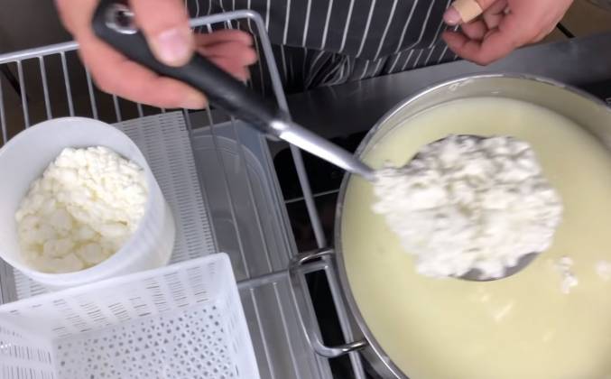 3. Все это время я перемешивал сыр и грел его. Вот и все! На термометре 38 градусов. У нас получился такой сгусток. Теперь нам его нужно перебазировать в формы. Как это делать? Все очень просто! Мы берем и выкладываем. Если формочек нет, можете использовать дуршлаг. Он тоже прекрасно подойдет. Мы выложили весь сыр в две формочки, Далее мы его оставляем прессоваться на 1 час. Но через полчаса мы его должны перевернуть, чтобы он прессовался еще и в обратную сторону. Через полчаса большая часть сыворотки стечет и мы из неё сделаем еще сыр рикотта. А та сыворотка, которая останется, мы ее пустим на дальнейшее приготовление сыра. Через полчасика вернемся, и я покажу вам, как нужно сыр переворачивать. Прошло полчаса, пришло время перевернуть сыр. Можете посмотреть. Помните, у нас была полная формочка. Теперь сыр спрессовался, из него еще вытекло чуть-чуть сыворотки. Теперь мы его переворачиваем. Как мы его переворачиваем? Смотрим - все очень просто! Мы берем наш сыр и переворачиваем. С этой формочкой все легко. а вот с этой будет чуть-чуть сложнее. Вот так мы его берем и переворачиваем. Теперь нужно его аккуратно убрать обратно в форму Теперь еще полчасика для того, чтобы сыр еще лучше спрессовался, и можем продолжать работать с ним. Итак, нагрелась наша сыворотка. Вот видите - обильное пароотделение. У меня к сожалению свалился в ней термометр. Поэтому я не знаю точную температуру, но могу сказать - здесь примерно от 85 до 90 градусов. Я это вижу по обильному выделению пара. Теперь наш спрессованный сыр нужно поместить вот в эту горячую сыворотку. На дно кастрюли я положил тарелку чтобы сыр не соприкасался с дном.