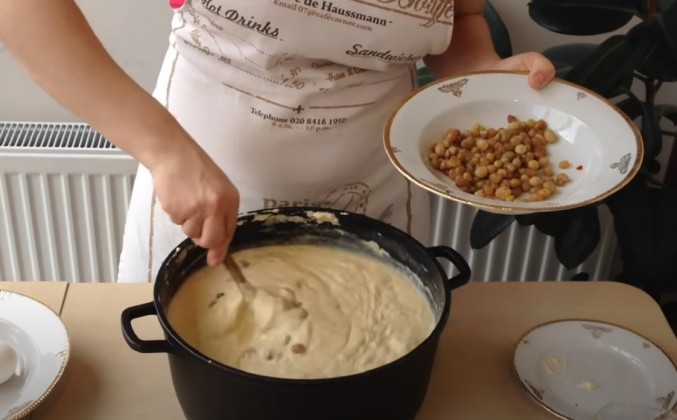 2. Взбиваем 5 яиц до хорошей густой пены. Теперь берём 4 стакана сахара, всыпаем частями и перемешиваем до максимального растворения. Вливаем растопленный маргарин комнатной температуры. Перемешиваем до однородной массы. Выливаем 15-20% сметану, сильно густую не надо. Но 15% - кисловатая, 20% - идеальная. Перемешиваем до однородной массы. Опара подошла 2-й раз, можем высыпать доклад в опару. Всё перемешиваем в одном направлении. Добавляем до полкилограмма запаренного на ночь изюма, можно - цукаты, чуть-чуть орехов. Орехи усаживают тесто. Всыпаем муку. Чем больше Вы кладёте муки, тем тесто круче и паска плотнее и суше. Мешаем в одном направлении до однородного состояния. Из 2 кг муки по рецепту у меня ушло 1,5. Берём 2-3 ст.л. оливкового или подсолнечного масла. Хорошо перемешиваем ложкой или руками. Накрываем крышкой и оставляем, чтобы оно постояло не более 5 минут.