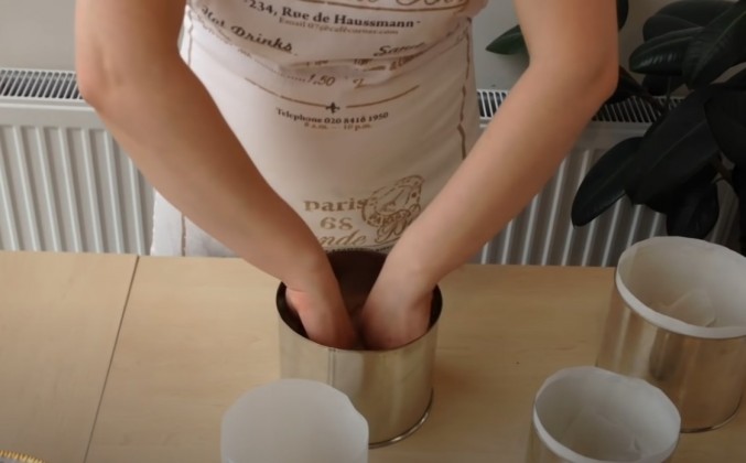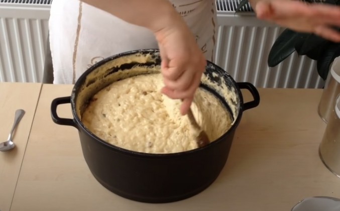 3. Разделю тесто на 2 половины. Должно быть место, куда тесту ещё подыматься. Ждём минут 15-30. Готовим формочки. Ничем не смазываем, вырезаем из бумаги для выпечки стенки миллиметров на 5 выше края, чтобы паска не прилипла. Вырезаем квадратное дно, укладываем, чтобы держало форму и вынимаем. Укладываем окантовку и кант вовнутрь. Тесто поднялось. Получилось две 8-литровые кастрюли поднятого теста. Хорошо перемешиваем. Чтобы тесто поднялось до кантика - нужно закладывать половину формочки. Если Вы хотите, чтобы сверху горбушка была, как грибом, то чуть больше половины формочки. Разогрейте духовку до 200 градусов С. Уменьшите температуру до 140-160. Выпекаются они минут 40-45. 1 вариант выпекания: выложить в формочку, дать подойти и ставить в духовку. Я не жду. Сразу ставлю в духовку, оно моментально поднимается и печётся.