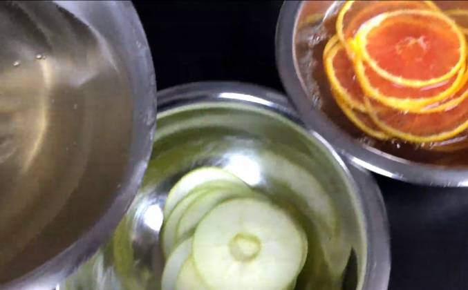 3. Из яблока первым делом нужно вытащить серединку. У меня для этого есть вот такой вот нож - специально для серединок. Если у вас такого ножа нет, вы можете разрезать яблоко, выковырять серединку и потом начинать уже резать. А у меня есть такой вот нож. Самое главное это пройти точно по центру. Отлично. Теперь мы можем делать точно так же как мы сделали с апельсином. Мы разрезаем яблоко и начинаем его нарезать. Апельсин - он очень хрупкий. Если его резать слишком тонко, то он не получится без дыр. Его весь разорвет, растрясет... В общем, он будет некрасивый. При этом, в нем очень много воды. Она вся уйдет и все равно чипс станет тонкий. Яблоко в этом плане немного другое. Я его сейчас буду резать на один миллиметр. Вот я порезал яблоки, и теперь мы их тоже кладём в миску. Теперь нам нужен кипящей горячий сироп. Зачем он нам нужен именно такой? Сейчас я его залью и вам все объясню.
