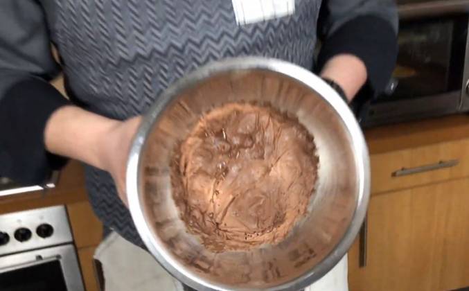 2.  Вот можете посмотреть: ганаш блестящий, гладенький. В нем еще есть немного пузырьков: но они на поверхности. Что мы делаем дальше? Из такого жидкого ганаша мы не можем сделать конфеты. Они все просто расползутся. Не хотите плоские конфеты? Тогда сейчас нам нужно это дело положить в миску, накрыть пленкой. Обязательно в контакт! И отправляем в холодильник для быстрого застывания. Все. Вот его сюда выливаем и кладем пленку. Убираем холодильник. Через 20 минут мы вернемся, и я вам покажу дальше как сделать конфеты - разные их варианты. Ну, что, мои дорогие сладкоежки, наш ганаш постоял в холодильнике. Вот он застыл - вы видите: он больше не жидкий. Он схватился. Вот тут у нас какао, в котором мы будем потом обваливать трюфели. Сразу предупреждаю, что это очень грязная работа. 3.  Если вы хотите спасти свои руки, наденьте перчатки. Если вы любите шоколадные обертывания, не надо перчаток. Я беру ложку, зачерпываю немного массы этой трюфельной и катаю из нее шарик. Скатал и сбрасываю его в какао. Обвалял его в какао и выкладываю на тарелку. Такими вот нехитрыми движениями мы делаем трюфели. Как я и говорил, это дело немного грязное - я испачкал все руки в какао. Но оно того стоит! Это реально очень вкусно! Я бы, если честно, я посоветовал бы дать им еще хотя бы ночь постоять в холодильнике. Тогда они сформируются полностью именно той текстуры, которая нам нужна.