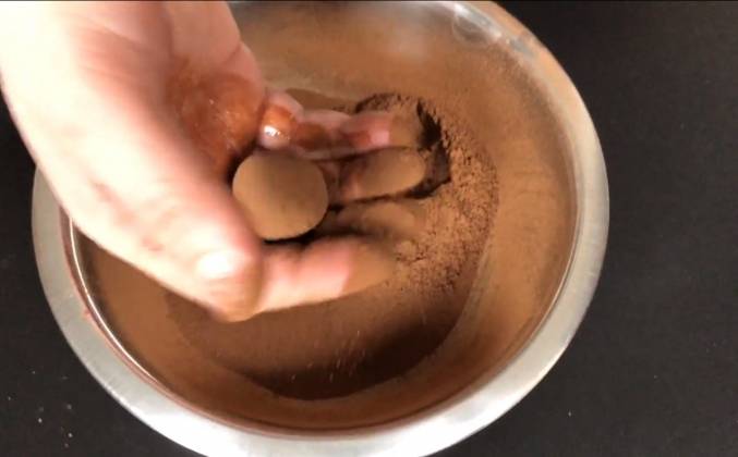 3.  Если вы хотите спасти свои руки, наденьте перчатки. Если вы любите шоколадные обертывания, не надо перчаток. Я беру ложку, зачерпываю немного массы этой трюфельной и катаю из нее шарик. Скатал и сбрасываю его в какао. Обвалял его в какао и выкладываю на тарелку. Такими вот нехитрыми движениями мы делаем трюфели. Как я и говорил, это дело немного грязное - я испачкал все руки в какао. Но оно того стоит! Это реально очень вкусно! Я бы, если честно, я посоветовал бы дать им еще хотя бы ночь постоять в холодильнике. Тогда они сформируются полностью именно той текстуры, которая нам нужна.Видео рецепт ютуб ниже 👇